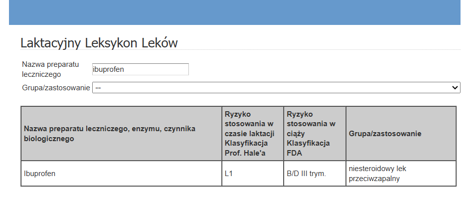 Żeby dowiedzieć się czy składnik aktywny Nurofenu jest bezpiecznym do stosowania w okresie laktacji, musimy nazwę łacińską przetłumaczyć na angielską, czyli Ibuprofenum na Ibuprofen i wówczas dostaniemy odpowiedź: